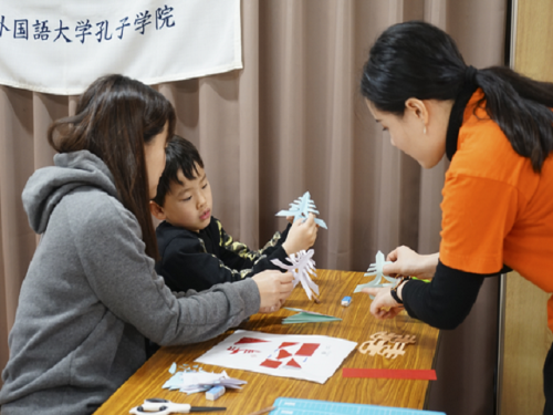 本次活动分为四个区域,分别是中国民间工艺品展示、中国茶艺、中国剪纸及中国民间娱乐。在中国民间工艺品展示区,展出了精美的中国结、皮影、剪纸等多种传统工艺品,让社区居民们能近距离欣赏到这些美丽的中国艺术;中国茶艺体验区,居民们不但能了解到中国传统的茶具、茶的分类、泡茶的方法及茶艺礼仪,还能亲身体验泡中国茶的过程,一品碧螺春的幽香;剪纸体验区的老师带领居民们一起学习了立体“春”和“囍”字的剪法,更有手巧的居民尝试了更为复杂的中国刻纸,由于今年是“猪”年,老师还特意准备了不同样式的“猪”图样,并为居民们介绍中国人春节贴窗花的习俗,居民们听了以后纷纷表示也要把自己的刻纸作品贴在窗户上,作为吉祥喜庆的象征;中国民间娱乐体验区受到孩子和家长的热烈欢迎,虽然空竹、太极柔力球和毽子对于日本人民来说可能还比较陌生,但是经过老师的介绍和指导后,大家都玩得有模有样,家长陪孩子一起学习,其乐融融,一时间,欢声笑语充满整个会场。