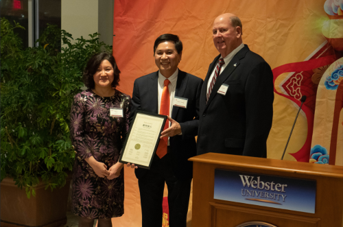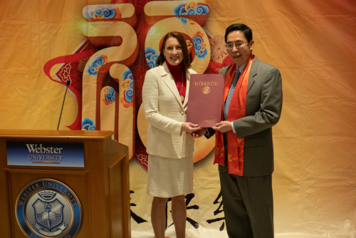 里士满高地市(Richmond Heights)市长吉姆•汤姆森(Jim Thomson)先生也应邀出席晚会并亲自向代表华人社区的圣路易中华文化中心董事长黄颖文、韦伯斯特大学孔子学院李淑萍女士送上贺电。