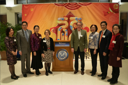 晚会开始前,韦伯斯特大学孔子学院美方院长李淑萍女士主持了答谢招待会。圣路易斯华助中心主任朱一民,韦伯斯特大学校长伊丽莎白·斯卓波女士(Elizabeth Stroble),韦伯斯特大学教务长、副校长兼首席运营官朱利安·舒斯特博士(Julian Schuster),中国驻芝加哥总领馆陈盈晖参赞,分别就“美国开放的未来”“多族裔社会的美国”“圣路易斯—南京友好城市建交40周年”等主题发表热情感言,并祝福华人社区新春快乐。