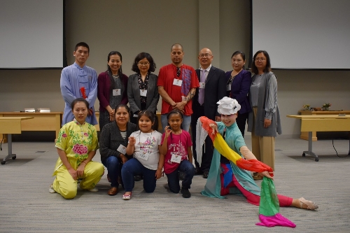 大会组委会在议程中专门为孔院安排了45分钟的中国文化展示单元。借此机会,孔院向与会专家奉献了一场精彩的中国文化展演。展演分中国民族舞蹈、中国武术两部分。首先由南卡资深华人舞蹈家殷岚老师带来一段具有浓郁京剧韵味的民族舞蹈。优美灵动的舞姿,再配以京剧《梨花颂》的音乐伴奏,令观众如痴如醉。接下来,来自重庆的太极师傅唐毅、来自内蒙古的功夫女侠张一帆分别为观众带来了极具观赏性的太极扇和九节鞭表演。唐毅炉火纯青的陈氏太极表演,动作柔和却充满力量,虽然只是短短五分钟,背后的太极服已经被汗水浸透。张一帆表演的九节鞭将中国武术的力与美演绎得淋漓尽致,将全场表演推向了高潮,赢得了全场观众的阵阵掌声和欢呼声。