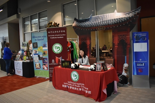 受主办方邀请,孔院在会议期间专门设立了展位,向与会专家展示了各种富有中国元素的展品,如民族服装、京剧脸谱、孙子兵法竹简、屏风,以及具有浓郁老北京建筑风格的门楼等。通过向与会嘉宾散发宣传页,介绍了孔院在南卡大学乃至南卡州开展的中文教学和中国文化交流类项目,如太极拳和中国武术课程、北京语言大学外教招聘信息、教育官员访华团、中文教师培训项目,以及孔子学院奖学金项目等。