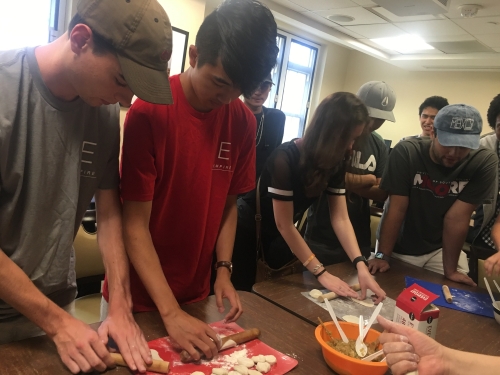 活动当天阴雨连绵,却挡不住大家参与的热情,活动尚未开始,已经有学生纷纷抵达现场。大家看到桌上摆好的饺子馅料和面团,热烈兴奋地讨论即将开始的活动。活动于下午五点正式开始,李越院长首先对大家的到来表示欢迎,简要向大家介绍了饺子的原料和制作方法,以及中国人吃饺子的习俗;接着便亲自上阵,示范讲解如何擀皮和包饺子。