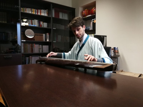 代恩礼是在汉语桥比赛前一个月决定参赛的。这一个月,他显示出了极高的配合度,几乎每天都到孔院办公室报到,学习才艺。说出来没人会相信,这个在比赛中身着汉服、镇定自若弹奏古琴的意大利人,只学了三周的古琴。三个星期,从完全不了解古琴,到能够默背曲谱、完整无误地演奏一首古琴曲,除了用功,恐怕没有其他词语可以形容。