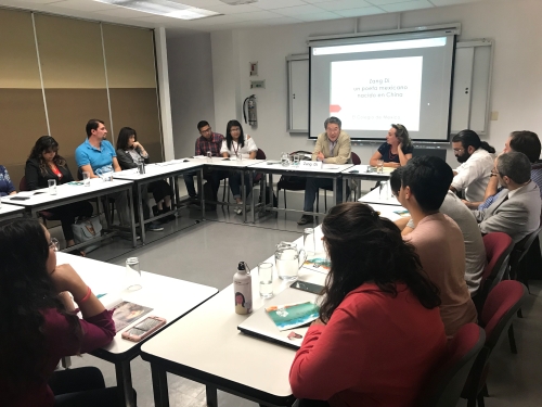 次日,诗人造访墨西哥学院(Colegio de México),与墨院从事文学、历史和亚非研究的师生进行了一场深度的诗歌交流活动。该活动由著名翻译家莉娅娜(Liljana Arsovska)主持,从比较诗学的角度,将中西诗歌中的若干传统进行了对比分析。嘉宾中著名汉学家白佩兰(Flora Botton)女士与臧棣讨论了在“五四”运动百年之际,应如何在新时代继承与创新的话题。