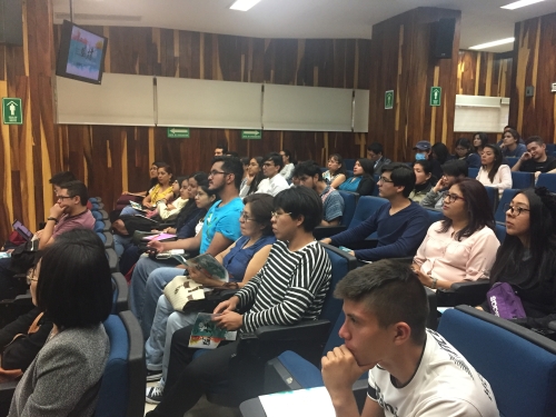 4月25日下午6时,北京大学文学院教授、诗人臧棣来到墨国大国立语言、语言学与翻译学院(ENALLT),与墨西哥著名诗人、墨城国际诗歌节主席曼努埃尔·夸乌特勒(Manuel Cuautle)对话。臧棣介绍了中国诗歌的发展脉络,认为中国古典诗歌注重审美感受,追求静穆的境界;而中国诗歌的现代转向始于新诗,强调诗歌与现实生存的关系,主张开放性,抛弃传统格律,情感表达也趋于激烈和混杂。曼努埃尔曾于2015年来华参加过青海诗歌节,他对臧棣的作品予以高度评价,认为其诗作完美地融合了中国传统文化与现代的表达方式。在他看来,拉丁美洲以往深受欧美文学的影响,而印第安文化实则具有强烈的“东方性”,因而在文学层面,中国与拉美在精神上是相通、互补的。之后,臧棣朗诵了三首以墨西哥人文景观为题材的诗作——《母亲的金字塔》、《龙舌兰》和《拉丁塔》,曼努埃尔则用西语朗读译文。作为回应,臧棣也朗读了曼努埃尔两首诗歌的中文译文。两位诗人的互动,印证了诗歌作为友谊的桥梁足以沟通不同语言与文化。墨国大ENALLT学院院长卡门(Carmen Contijoch)女士和墨国大师生共100多人参加了本次活动。