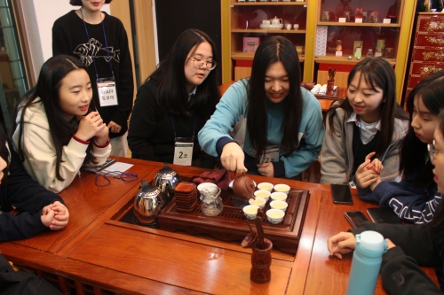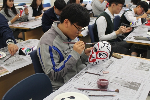 讲座结束后,学生们走进文化体验教室,不同的文化项目分别有序地展开。户外草地上是慢悠悠的八段锦教学,学生们一招一式学得有模有样,当得知奖品是一只熊猫玩偶时,都涌向“擂台”大胆演示。茶艺室里,老师边讲解边演示,绿茶、黑茶、乌龙茶,茶香氤氲、沁人心脾,也拉近了韩国学生与中国文化的距离。剪纸、中国结、京剧脸谱等教室格外热闹,学生们兴奋地互相展示、比较各自的作品。传统服装体验教室里不时传来掌声,走近一看,原来那位穿着旗袍的美女竟是一个男儿身。民族服饰的多样性让学生感受到了多元的中国民族文化。精彩的中国文化体验到这里并没有结束,压轴的 “川剧变脸”表演让韩国学生们发出阵阵惊呼,真正领略到中国传统文化不可思议的魅力。