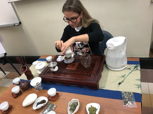 有了喝茶的好器具,茶叶自然也不能将就。这次准备的茶叶,都是9月份从中国带来的,绿茶、黄茶都是当年的新茶,张潇雅老师想让同学们尝尝正宗的明前西湖龙井是啥味道。