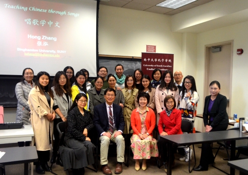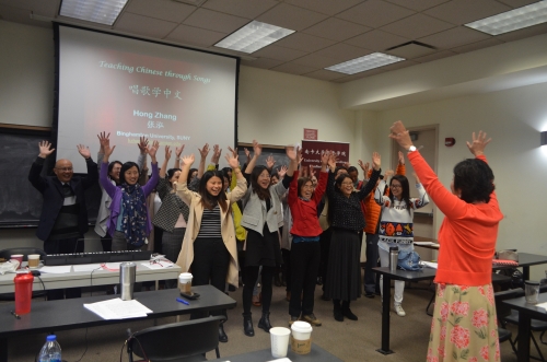 张泓教授是宾汉顿大学兼教中文和声乐的终身教授,也是美国著名的歌唱家。“唱歌学中文”是她首创的一种行之有效的中文教学方法,并出版有专门教材。此次培训中,张教授首先向教师们讲解了如何正确发声、正确发声及其在中文学习中的重要性;随后带领大家从基本发音练起,学习演唱了《阿里山之歌》、《卖汤圆》、《达坂城的姑娘》、《思念》、《歌声与微笑》等多首歌曲,亲自示范如何分步骤将这些歌曲运用到具体的课堂教学中。参与培训的中文教师们纷纷表示,这种寓教于乐的方式非常适合美国学生,并且歌曲旋律优美、语调清晰,会对学生的汉语发音大有助益。