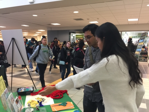 当天的活动在主校区约翰逊中心(Johnson Center)举办,前来咨询和体验的学生络绎不绝。孔院带来了剪金鱼和剪蝴蝶活动,还向前来咨询的学生介绍了本学期和2019春季学期举办的各种文化体验课程和初级语言及会话课程,并展出了部分学员的文化活动作品,如国画课的菊花,手工课的画纸伞、石头绘画、折纸扇、泥捏熊猫等,当听说所有文化活动和体验课都不要求语言及专业基础时,很多同学都很兴奋,跃跃欲试。