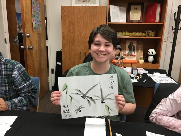 乔治梅森孔子学院国画课程的教师除了教师志愿者陈雪外,还有一位当地美国人伯恩(Bob Bernhards),他师从于中国画家,学习国画已30余年。他擅长山水花鸟画,缘于对国画的热爱,曾多次到中国旅行,感受国画中的山水韵味。自2016年起,他来到乔治梅森孔子学院担任国画课程的志愿者,在国画课上给予学生指导,与孔院的教师合作进行国画教学。伯恩说:“孔子学院提供了一个体验中国文化的平台,能够让更多的美国学生感受中国国画艺术的魅力,这是一个了不起的项目。”
