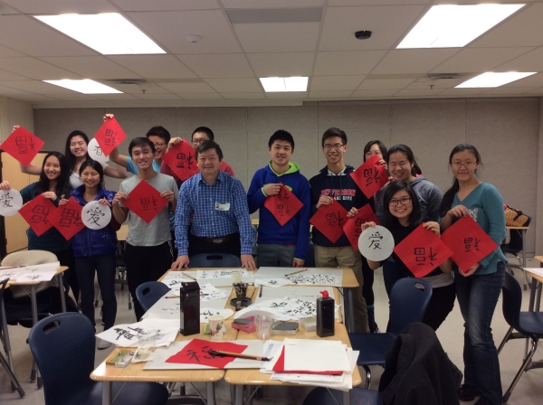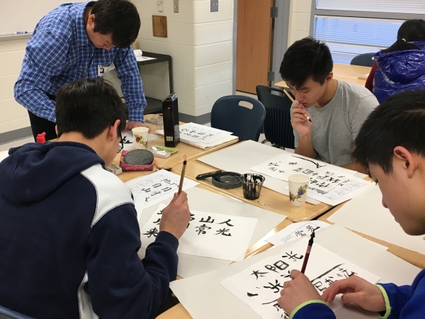 王晓亮老师给AP 中文班的学生们介绍了“文房四宝”并示范书写,同学们挥毫弄墨,临摹起名家字帖来。虽然大都是第一次使用毛笔,但不一会儿就掌握了要领,写得像模像样。最后大家一起在红纸上书写大大的“福”,表达了对新的一年的祝福。