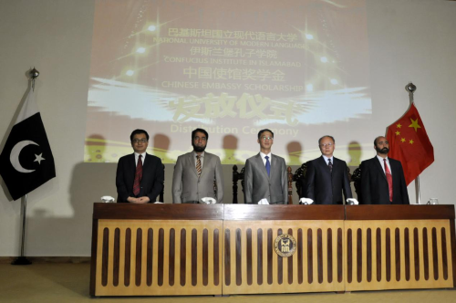 由中国大使馆设立的“中国使馆”奖学金的颁发仪式于5月2日下午在巴基斯坦国立现代语言大学举行,中国驻巴大使姚敬、文化参赞游翼、国立现代语言大学常务副校长穆罕默德·伊布拉汉姆准将等应邀参加了此次仪式。伊布拉汉姆准将代表国立现代语言大学在致辞中对中国大使馆长期以来给予巴基斯坦教育事业的帮助表示感谢,希望本次奖学金的获得者能为中巴友谊做出贡献。中国大使姚敬也高度评价了国立现代语言大学在中巴文化交流过程做出的突出贡献,强调语言在国际交往和友谊传承方面所发挥的重要作用,并且希望未来使馆和大学有更多的教育方面的合作。