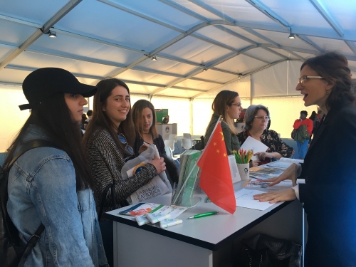 每次开放日活动,圣心孔院的工作人员都会早早去布置好展台,让展台附近充满浓浓的中国风味。很多有趣的中国元素,比如熊猫、中国结等都会吸引来客的驻足。不少人前来咨询孔院的汉语课程、夏令营活动,还有去中国留学的奖学金、双学位等问题。圣心孔院的工作人员会用英语或意大利语给他们进行耐心详尽的解答。除了想要来圣心大学学习的学生和家长之外,也有不少的社会人士关注有关中国的信息,比如一位葡萄酒商人来咨询商务汉语和中国经济等方面的内容。