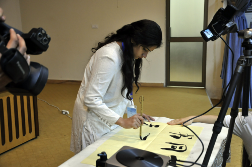 二号选手米莎用她的水墨画在炎热的巴基斯坦给在场的观众带来了荷花的清凉。