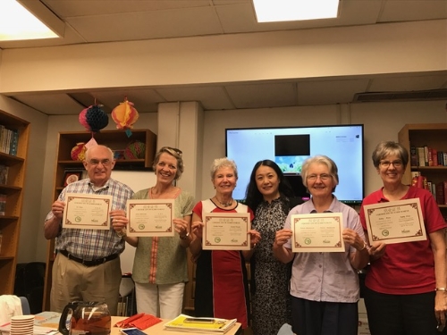当地时间6月14日中午,梅森孔院阅览室不时传出欢乐的笑声,大家一边品尝着各自带来的美食,一边兴奋地用汉语讨论着暑假计划。这是梅森孔院“初级汉语会话”暑期的最后一次课程,几位学员都是周边社区的退休人员,在一起上这门课已经第三个学期。初次上课,是2017年秋季,大家当时讨论的话题是“我的暑假”,当时说的“暑假我去……了,我是跟我先生/太太一起去的,我们是坐飞机去的,我们是7月20号去的,7月30号回来的,去了10天。我以前去过/没去过那儿”。今天,老师请学生们把这段话中的“了,是……的”删除,讨论即将到来的暑假。Kathy说,“原来这么简单”。
