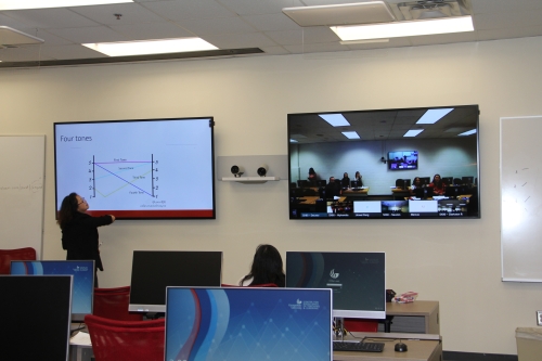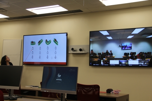 当地时间8月21号下午2:30,佐治亚州立大学邓乌迪(Dunwoody)校区新学期第一节汉语学分课准时开课。佐治亚州立大学孔子学院的中文教师彭锦维老师正在用汉语亲切地向新学生打招呼。与以往不同的是,彭老师不仅可以教授佐治亚州大学邓乌迪(Dunwoody)校区的学生,还可以和远在几十公里外的其他四个校区的学生进行实时授课及互动。