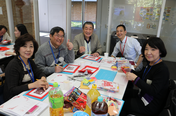 最后,老年大学的学员们介绍了日本的“折纸”文化。他们事先做好了很多“纸鹤”、“武士盔”、几层折纸叠加在一起的“花陀螺”等作品,并带到了交流会上。学员们手把手地教,孔子学院老师们认真地学,一边折纸、一边用汉语和日语交流,气氛融洽友好。