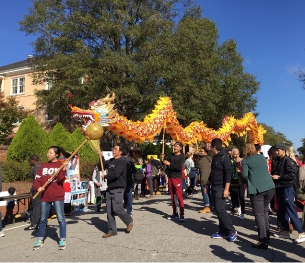 南卡孔院还积极支持南卡大学中国学生会的国际教育周活动。孔院出借给中国学生会大量的中国文化物品,学生们穿上憨态可掬的熊猫服,成为现场非常受欢迎的中国吉祥物。学生们用精美的图片介绍中国的名胜古迹、教美国学生说简单的中文、还用无人机悬挂中国国旗进行展示。哥伦比亚当地的华人协会和南卡大学中国学生会合作组织了舞龙队,在国际教育周现场舞起了震撼全场的中国风。