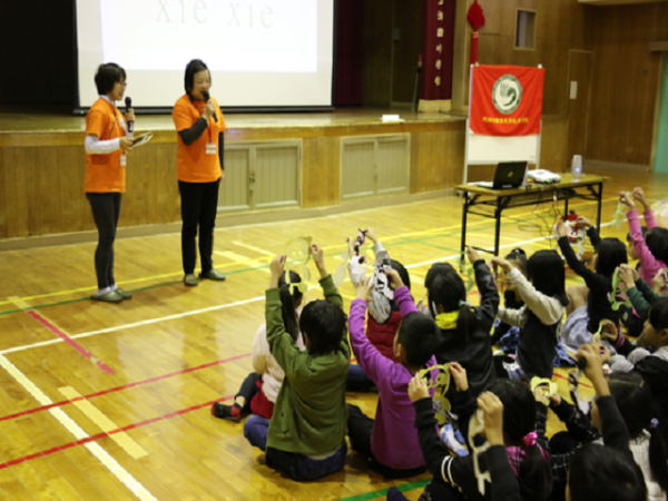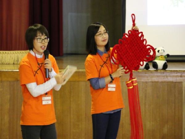 活动一开始,孔子学院教师和志愿者教师们用“你好!”向学生们问好,孩子们也纷纷用汉语回应。然后,主讲老师通过PPT和视频讲解中国地理和熊猫知识,用提问的方式调动孩子们的积极性:“中国的首都是哪个城市?”、“大阪离北京有多远?”、“今年上野动物园出生的熊猫宝宝叫什么?”等等。问题一出,孩子们纷纷举手,争先恐后地回答。在介绍熊猫的视频中,孩子们看到大熊猫憨态可鞠的样子,开心地说“卡哇伊”。之后又介绍了剪纸和中国结的基本知识,展示了剪纸和中国结作品,孩子们认真听讲,表现出了浓厚的兴趣。现场不时充满学生们开心的笑声和踊跃回答问题的欢快声音。