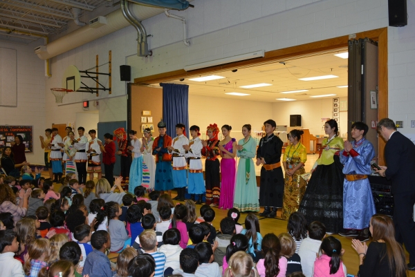 主要由中央民大舞蹈学院学生组成的歌舞团第一次来到美东地区访问,就由梅森孔院邀请到韦斯特布瑞尔小学(Westbriar Elementary School)进行表演。表演一开场就吸引了孩子们的注意力。无论是蒙古族、哈尼族、傣族的舞蹈,还是朝鲜族、藏族的民歌以及马头琴、二胡等器乐表演,总能引得孩子们或惊呼,或击掌,或开心大笑。两个小时的表演中,他们完全被中国大学生的表演所征服。