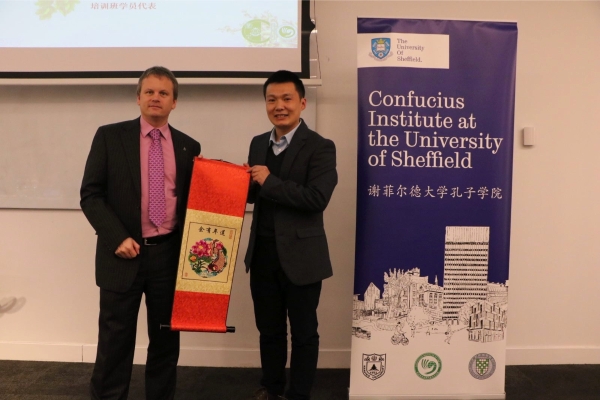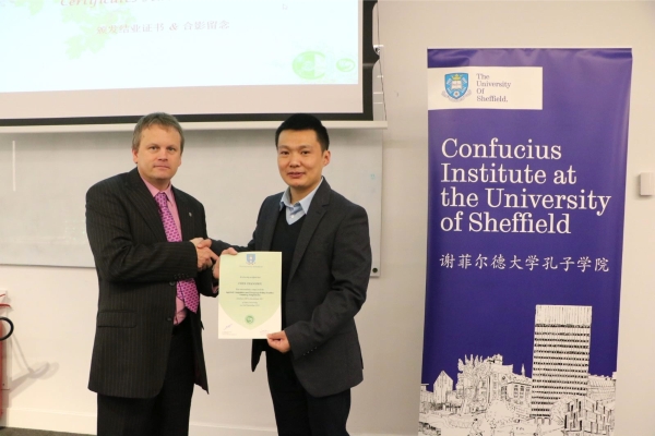 2017年12月21日,由教育部语言文字信息管理司主办,谢菲尔德大学孔子学院承办的“语言文字优秀中青年学者出国研修项目”举办结业仪式。来自国内高校、科研院所从事语言文字相关研究的30位中青年学者顺利完成了为期三个月的研修活动。谢菲尔德大学副校长、国际合作负责人白特勒(Malcolm Butler)博士和谢菲尔德大学全球机遇与交流主管、国际合作执行主任多蒂·史蒂文生(Dörte Stevenson)出席结业仪式,白特勒副校长还为学员颁发了结业证书。