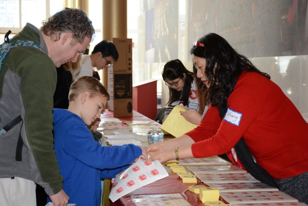地时间2月17日,中国农历狗年大年初二,华盛顿市肯尼迪中心(The Kennedy Center)一层大厅的乔治梅森孔院中国生肖文化展台前,很多前来参加中国新年家庭日活动的当地居民都领到了第一件新年纪念品----属于自己的生肖贴。当天,由中国驻美使馆文化处与肯尼迪中心共同主办的 “欢乐新春--中国新年家庭日”活动吸引了上万名当地民众参加。