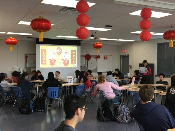 当地时间2018年2月20日,在当地负有盛名的马歇尔高中(Marshall High School)的中文教室里,40余名学习中文的学生与自己的中文老师以及来自乔治梅森孔子学院的两位老师一起,欢天喜地迎春节。