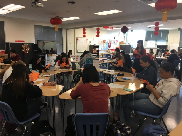紧接着,乔治梅森孔子学院的姜宇老师指导学生们做春字剪纸和灯笼剪纸,一边剪,一边学习“春节”“春天”“灯笼”,成就感满满。李娜娜老师针对高中学生的特点,带领同学们学习了两首中文歌曲——《好想你》和《对不起我的中文不好》,获得了大家的一致喜爱。活动结束后,马歇尔高中的付丽老师对孔子学院的老师表示了深深的感谢。付老师在马歇尔高中担任中文老师数十年,退休后仍积极参与学校的中文项目,并时常参加梅森孔院的教师工作坊“充电”,对于梅森孔院数年来中文教学和活动的支持表示了由衷的谢意。本次送新春活动为孔子课堂的师生带来了过年的喜庆。