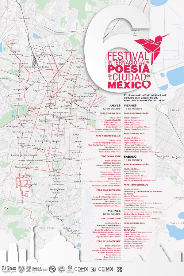 2017年10月12—14日,第六届墨西哥城国际诗歌节在墨城市中心的宪法广场隆重举行。此次活动是墨西哥城国际图书节的一部分,该图书节每年一度,为期两周,其间有大约一百万市民光顾。从五年前起墨西哥国立自治大学孔子学院就与墨城诗歌节保持合作,推荐中国诗人参与。今年则更上一层楼,墨国大孔院、孔院拉美中心与墨城国际诗歌节组委会联合举办该项活动,来自墨西哥、西班牙、德国、智利等多个国家的四十多位诗人汇聚这一诗坛盛事。今年墨国大孔院邀请了两位中国诗人参加此次诗歌节,一位是来自云南普米族的诗人鲁若迪基,另一位是来自上海的诗人舒冲。