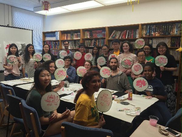 绘制中国传统团扇活动在整个系列活动中人气最高,吸引了近三十名学生参加,两个教室座无虚席。学生们首先学习国画渲染、勾勒等技巧,然后自己动手画荷花。先用毛笔蘸墨调和清水勾叶和茎,用花青墨色轻轻分染荷花的叶脉,再将荷叶大片罩染上绿色,然后将荷花罩染上朱红色,最后分染花蕊和莲蓬。这样一个栩栩如生的荷花扇面就完成了!之前参加过篆刻活动的学生还拿出了亲手雕刻的印章印在扇面上, 更加锦上添花。每位参与者既了解了中国画,又手持团扇满意而归。
