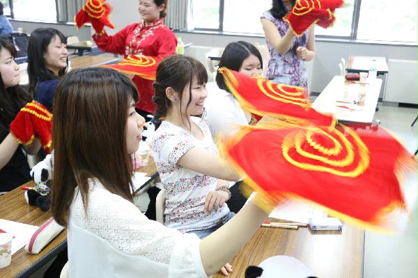 知识竞赛环节之后,是文化体验环节。文化体验项目丰富多彩,独具中国特色:太极拳、太极扇、转手绢、剪纸和中国结。在老师的耐心指导下,大家有模有样的打起了太极拳,练起了太极扇。一块块红红的手帕,伴随着欢快的笑声,飞快的旋转着,教室里一片热闹欢愉的景象。